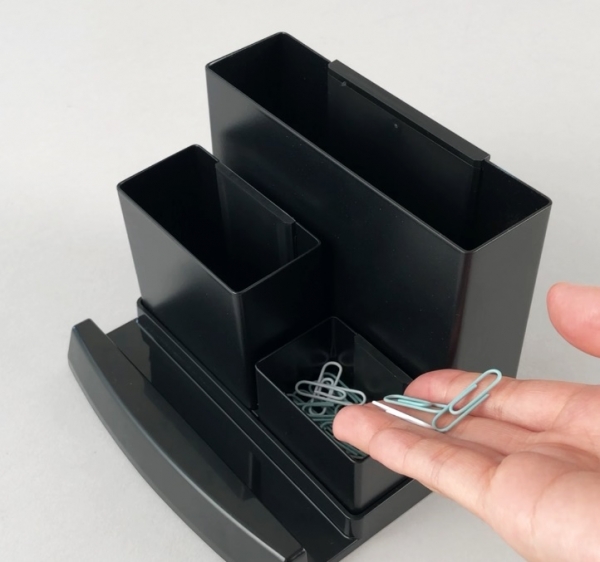 今回発売する『デスクオーガナイザー (TS-003)』は、3種類のサイズ違いの収納スペースが特徴で、クリップやピン等のバラけてしまいがちな小物から、電卓やノートのような幅のある物までサイズに合わせた収納スペースに区分することが可能です。
