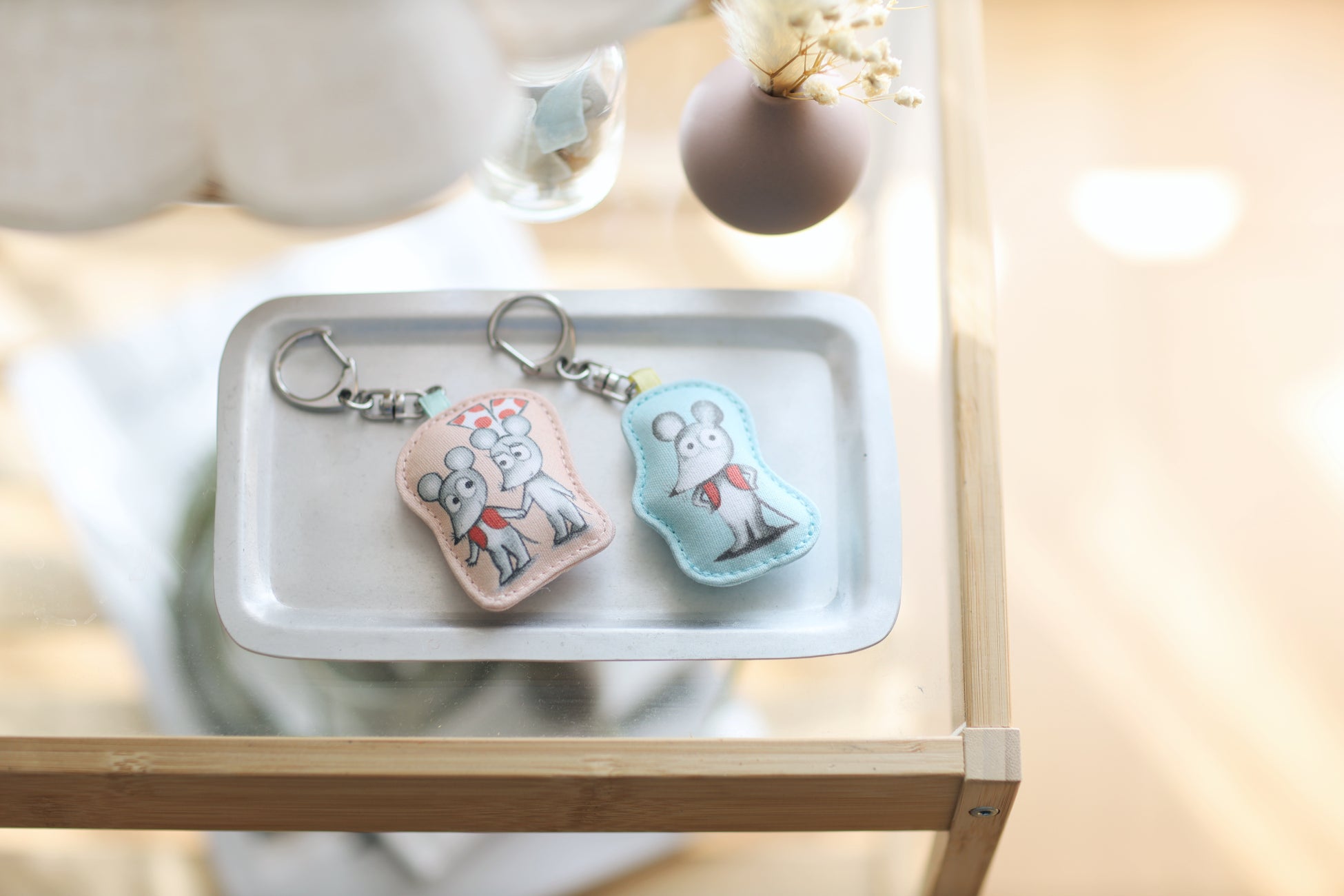 ぷっくりと中身の詰まったコットン生地にねずみくんたちがプリントされた立体感のあるキーホルダー。