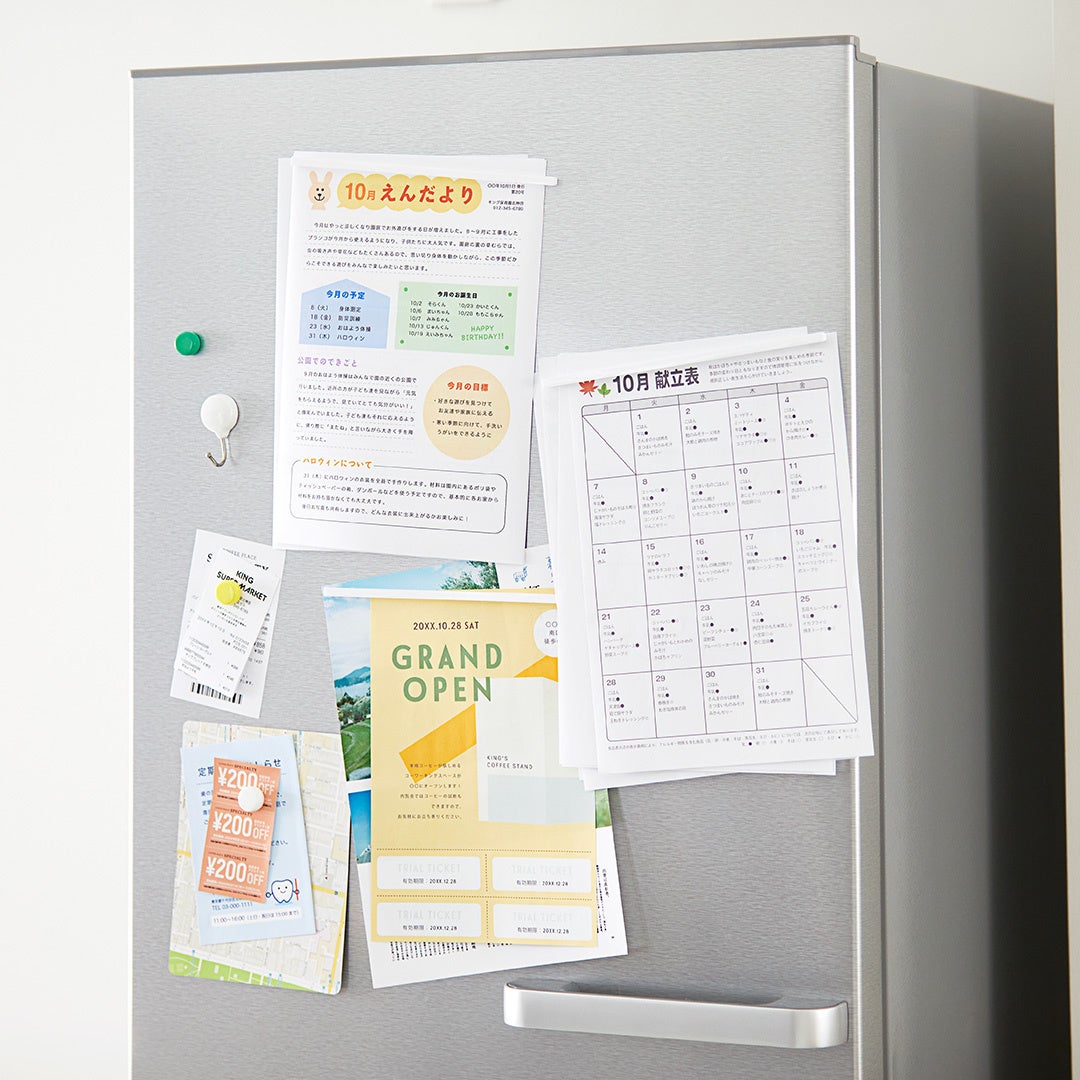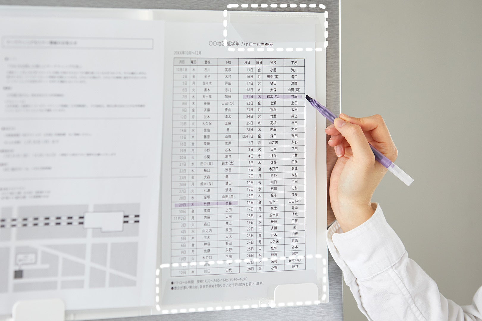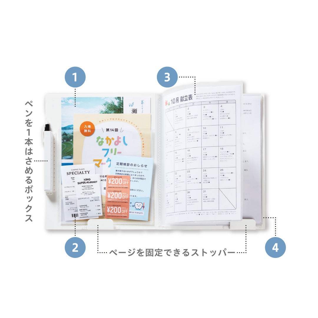 異なるサイズの書類をひとまとめにでき、閲覧性にも優れています。A4書類や学校からのおたより、当番表などの書類の収納に適しています。