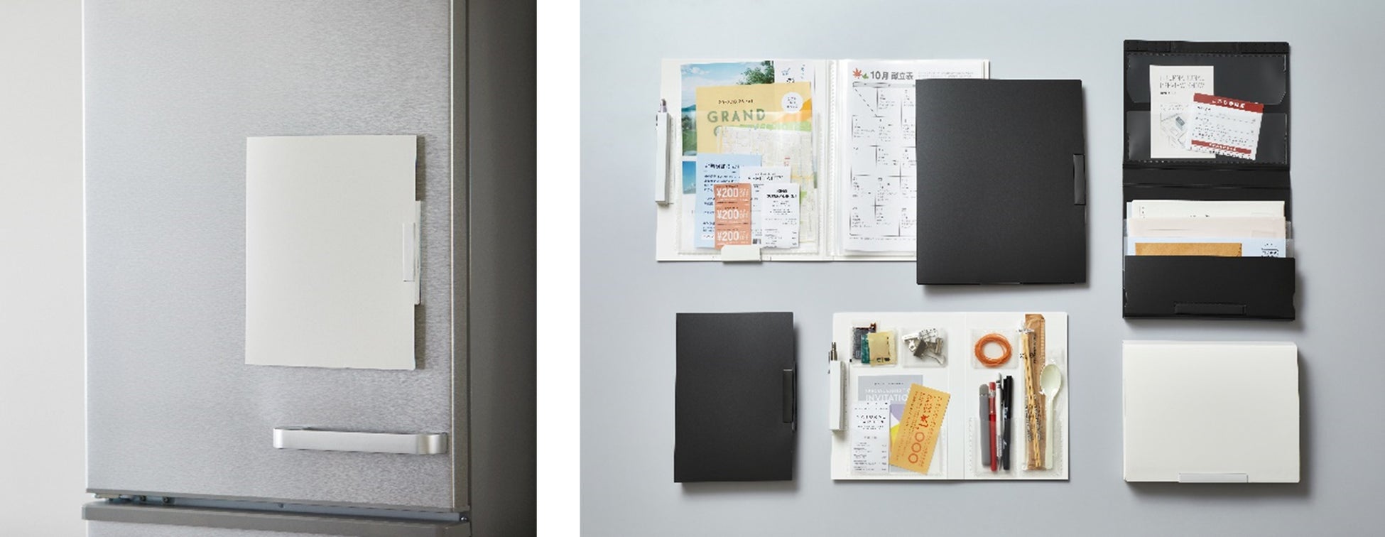 今回、現行品の特長はそのままに、スタイリッシュに変わりつつある現在の冷蔵庫に合わせ、デザインをアップデートしました。用途別に選べる「書類整理タイプ」「小物整理タイプ」「郵便整理タイプ」の3つをラインアップし、書類以外にも冷蔵庫まわりで溜まりがちなものを1冊に収納できます。マグネットで貼り付くので、冷蔵庫のほか、キッチンの壁や玄関でもご使用いただけます。