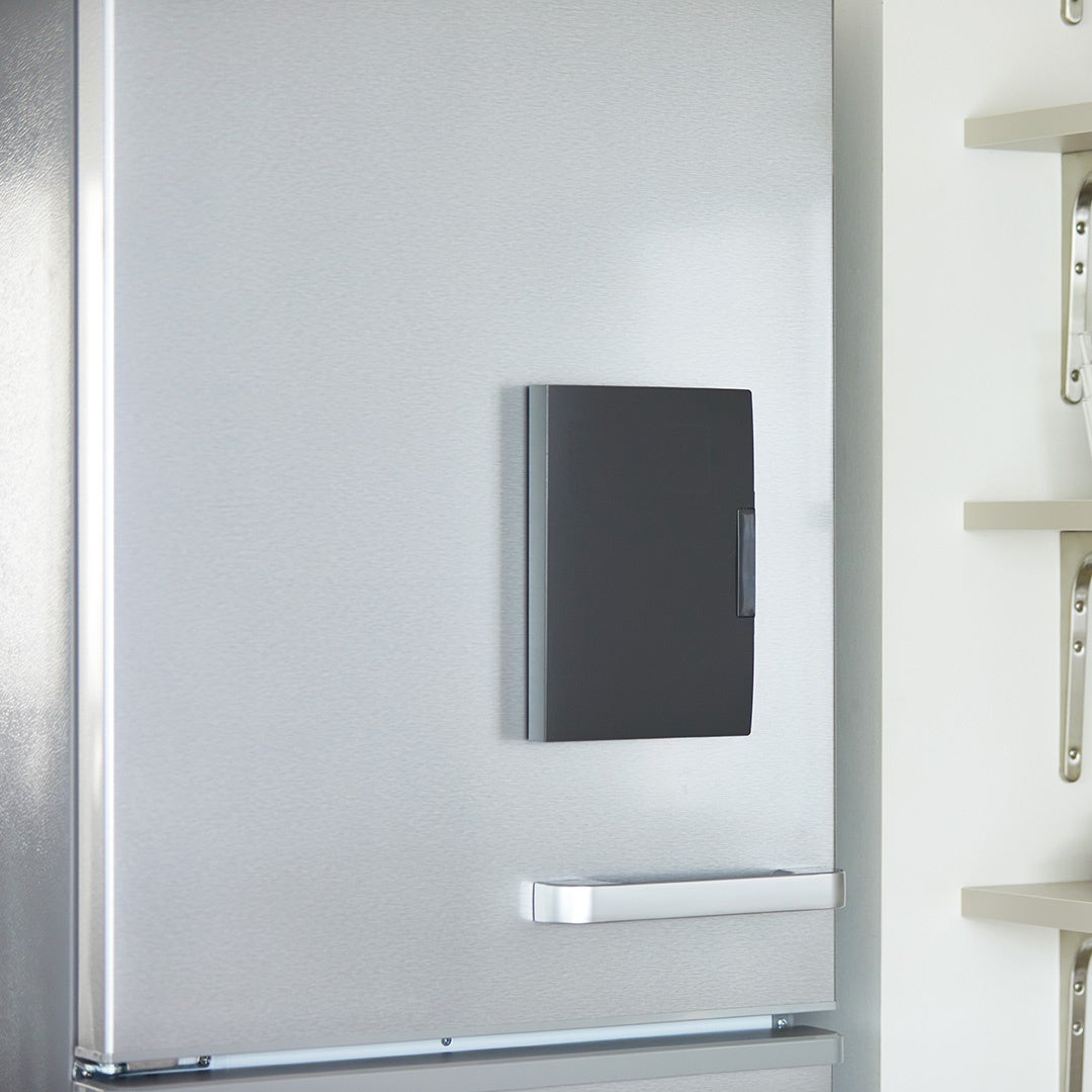 十分な収納量と閲覧性があり、見開きで貼り付けておけば探したいものがすぐに見つかります。来客時などは、表紙を閉じれば冷蔵庫まわりがスッキリ隠せます。