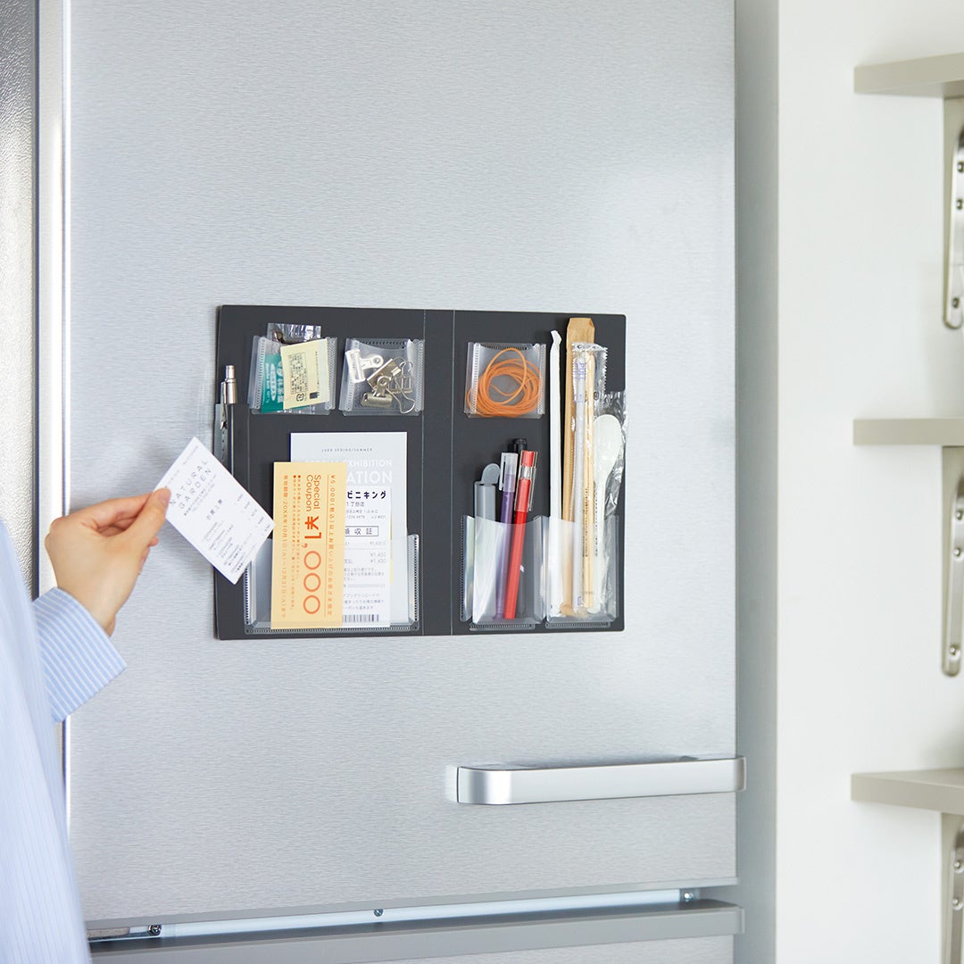 冷蔵庫まわりの散らかりがちなアイテムをひとまとめにし、マグネットで貼り付けられるファイルです。「書類整理タイプ」「小物整理タイプ」「郵便物整理タイプ」の3タイプを展開します。