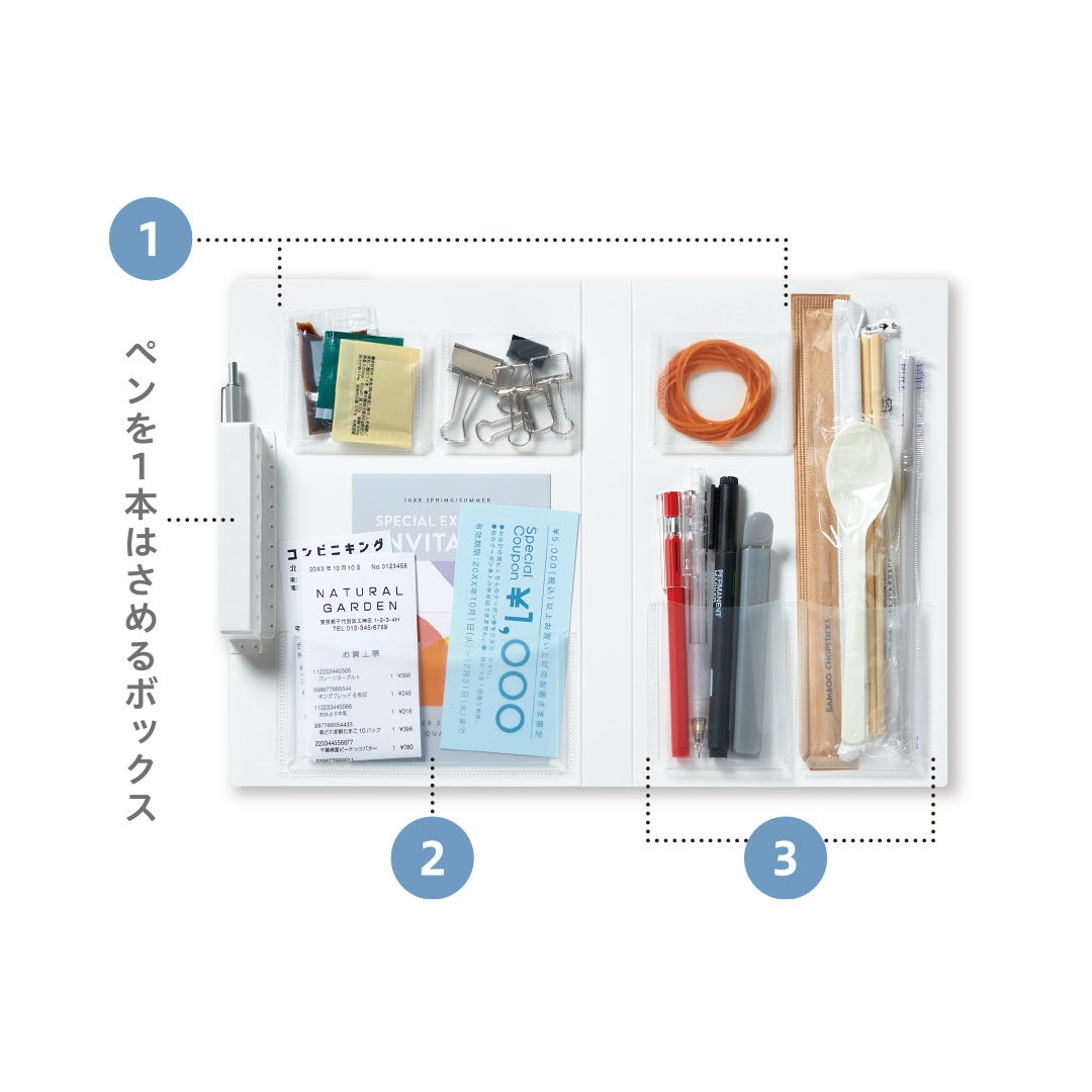 6つのポケットで効率的に収納でき、使いたいものがすぐに見つかります。輪ゴムやクリップ、レシートなどの細々としたものの収納に適しています。
