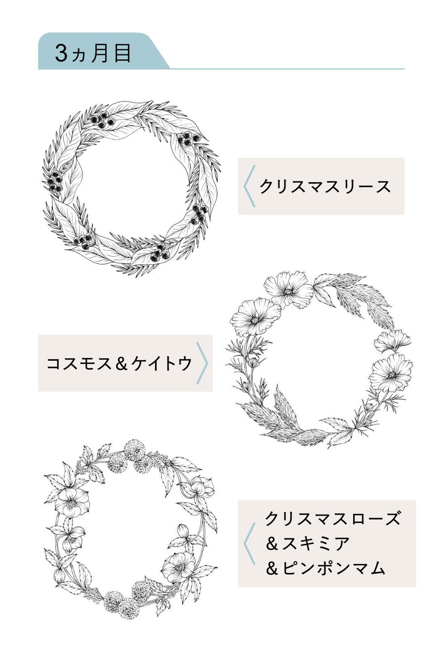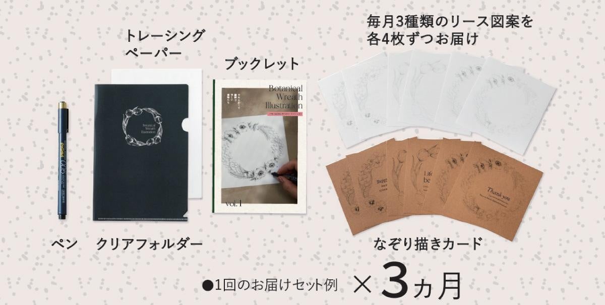 毎月3種類のリース図案が各4枚ずつ届きます。季節を感じながら、静かにお手本をなぞる作業で心も穏やかに。美しいボタニカルイラストを完成させるたびにリフレッシュすることができます。