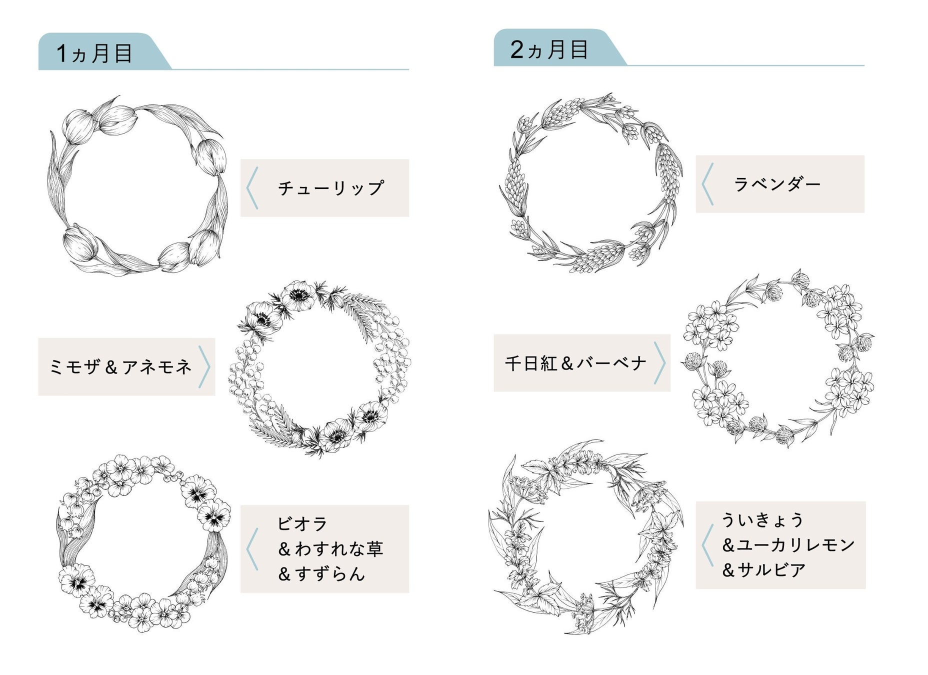今にも風にゆれ動きそうなほど、繊細にして可憐な植物画を、なぞって描き足すだけで素敵な「ボタニカルリース」のイラストを描けるようになる全3回の癒やしのプログラムです。毎月3種類×3ヵ月で9種類もの「ボタニカルリース」を完成させることができます。毎月、少しずつお部屋がお花で満たされていくのも素敵です。美しいお手本を描いてくれたのは、イラストレーターでデザイナーの櫻井志保さん。シンプルに額などに入れて飾って楽しむのはもちろん、アレンジしながら暮らしの中で自由に遊べるのもこのプログラムのポイントです。