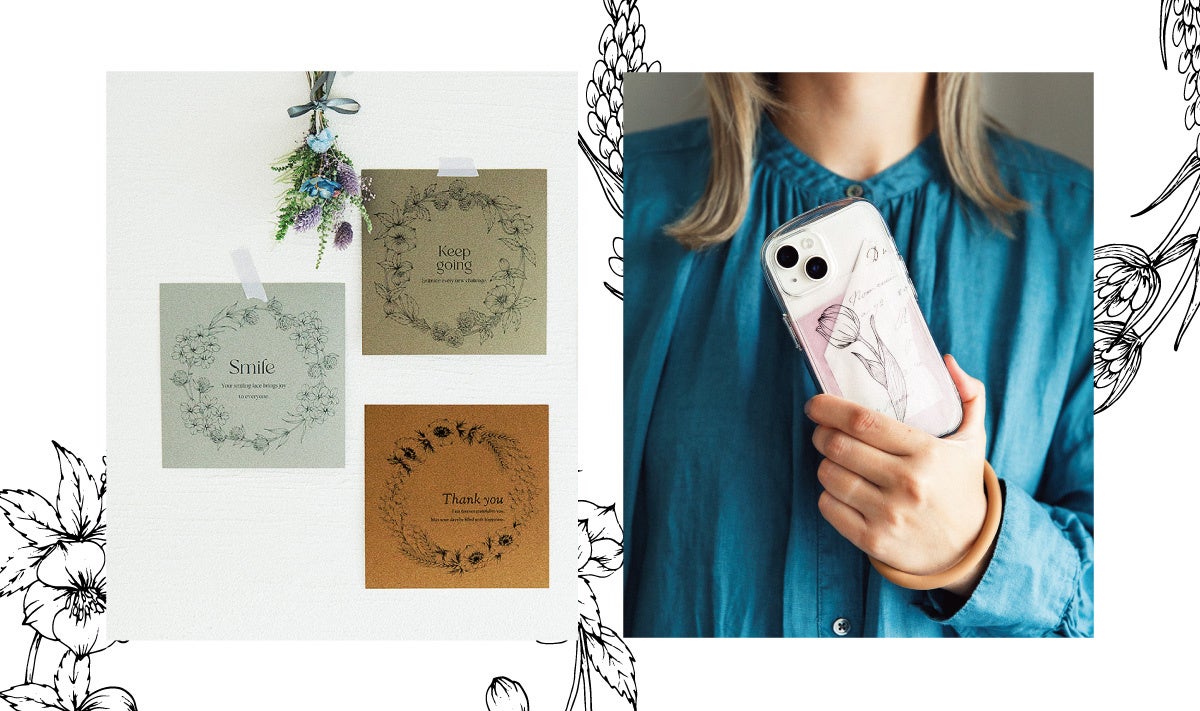 植物をそのままお部屋に飾るのも素敵ですが、リアルなボタニカルリースのイラストを自分で描くという一歩進んだ楽しみ方を体験できます。グレーやカーキなど色味が洗練された印象のなぞり描きカードや、英字メッセージ入りのカードも届くので、壁に飾ったり額に入れたり、楽しみ方もいろいろ。慣れてきたらトレーシングペーパーに写しとってデコレーションやブックマーカーにアレンジも!