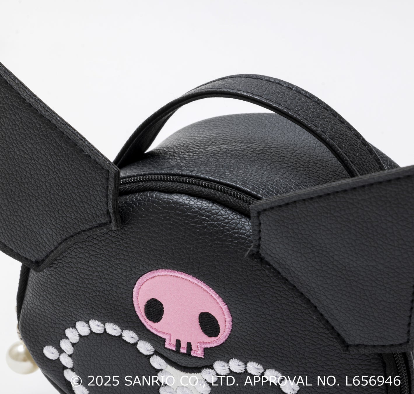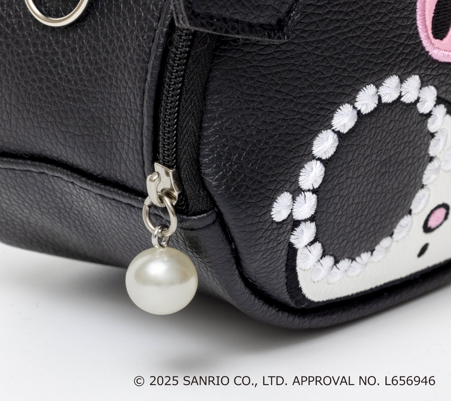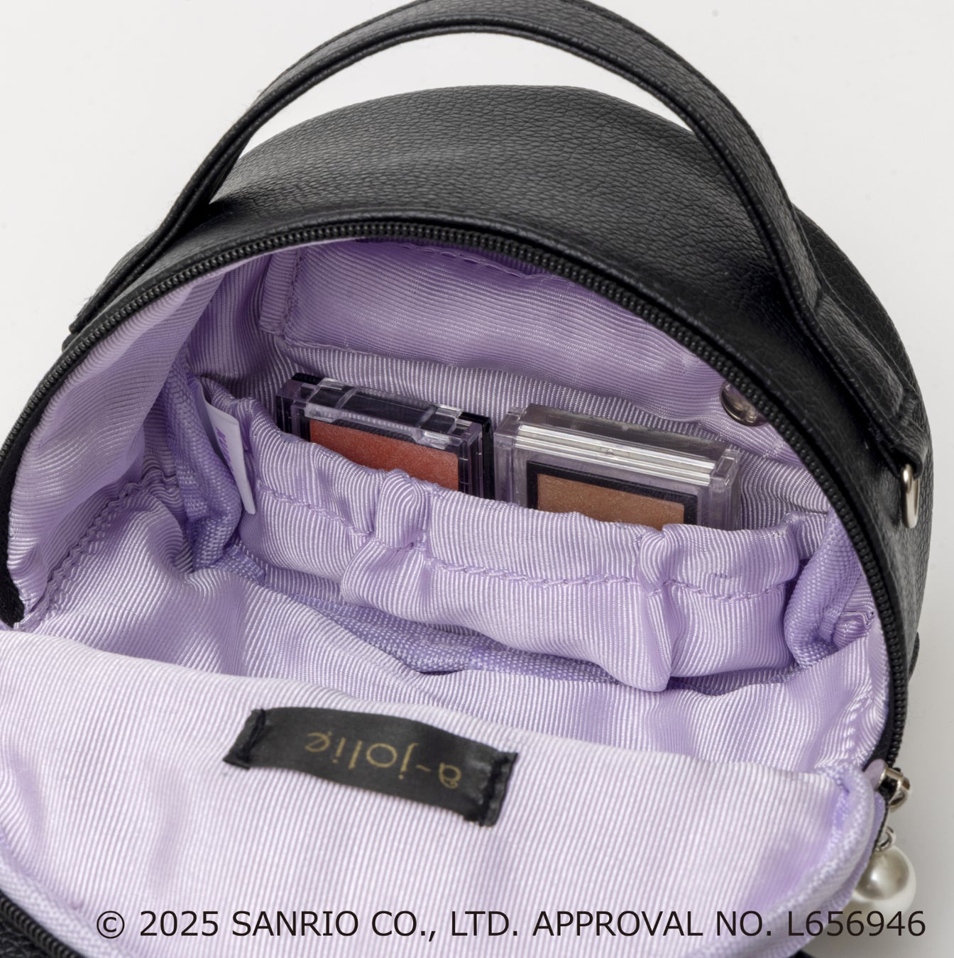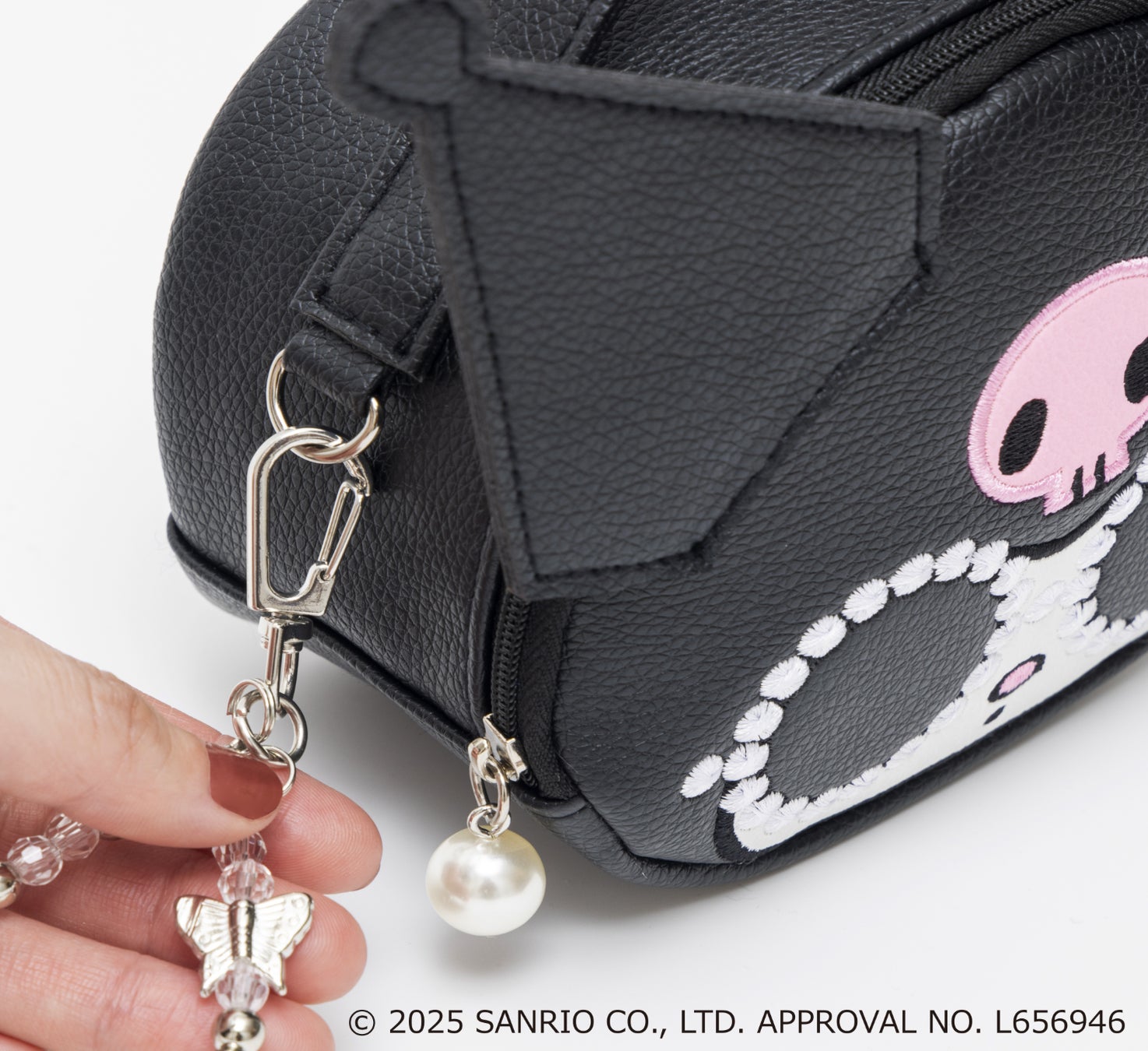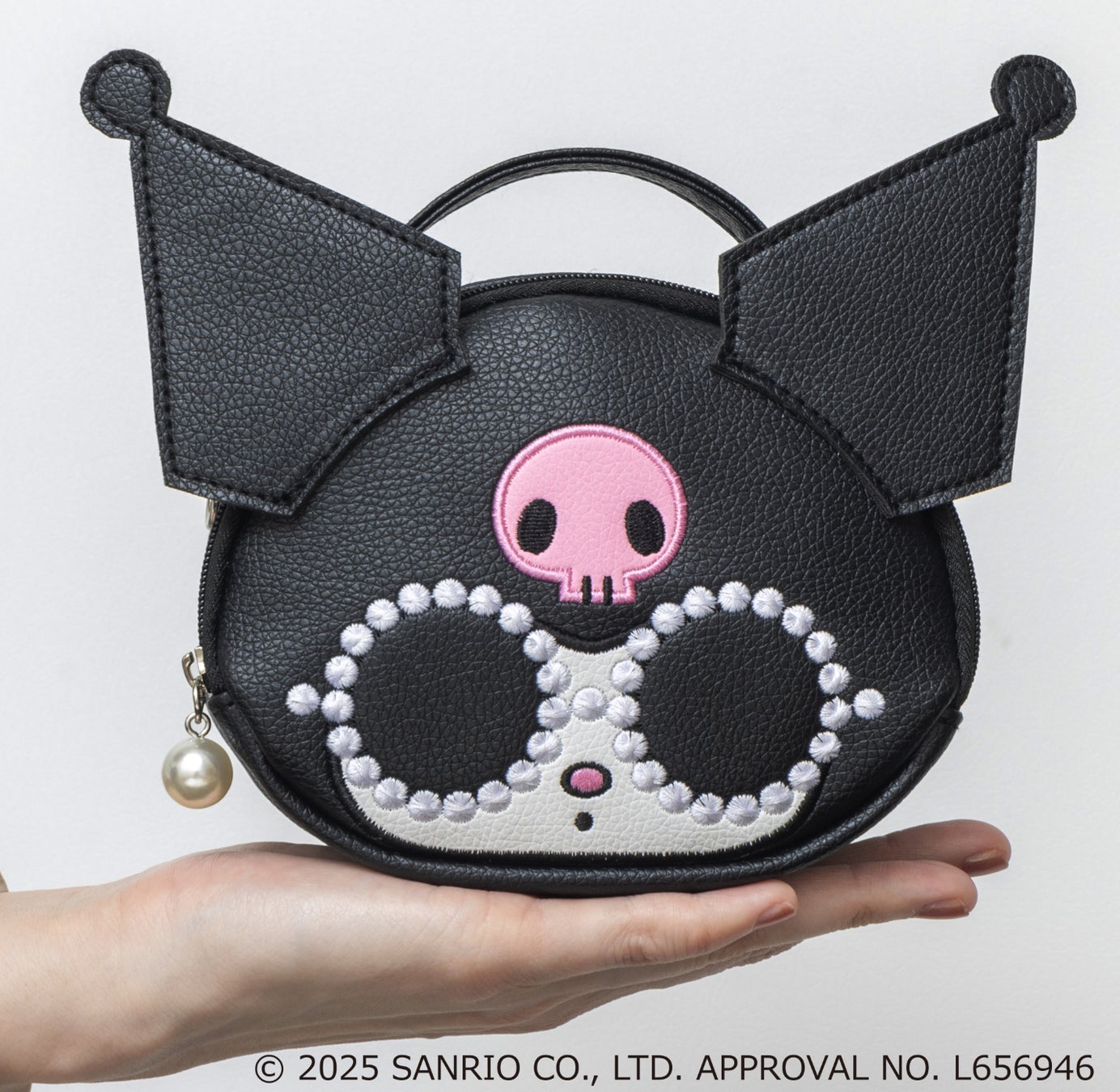 アジョリーのアイコン「パールサングラス」をかけたクロミが目を引くアクセサリーポーチは、シボのある肉厚レザー調の生地で高級感たっぷり。リングを収納できるベルト付きで、マチも広いのでコスメや文具も入ります。手持ちのストラップを付ければバッグとしても使える、機能面も優れた大人の