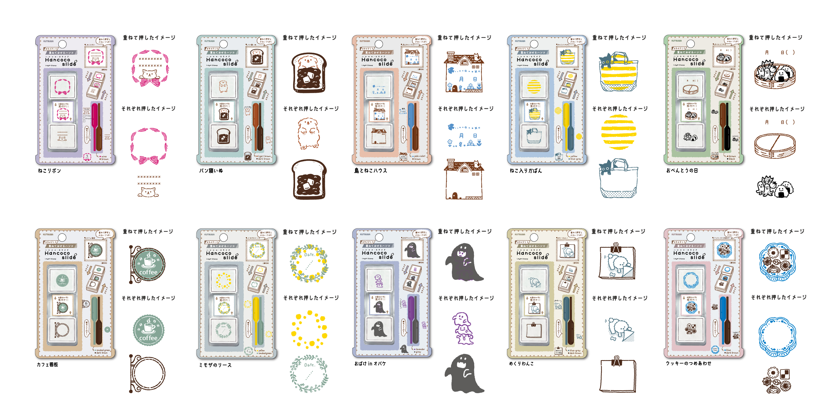 学童文具・生活雑貨メーカーのクツワ株式会社(本社:大阪府東大阪市、代表取締役社長:寺浦 浩之)は、 重ねおしてもハンコがズレない「ハンココスライド」を2025年8月に発売しました。 2色2柄のハンコがセットになったハンココスライドは、ハンコをケースの中でスライドさせて軽く押すだけ。「ハンコが微妙にズレて手帳デコが台無し」という重ねおしの悩みを解消します。 3cm角でマンスリー手帳の1日分の枠にちょうどいいサイズだから手帳との相性がバツグン!ネコ、花、食べ物といった人気のモチーフを揃え、重ねることで物語を感じるような絵柄が完成します。全10種類の豊富なバリエーションはデザインを自由に組み合わせて楽しむことができます。全国の文具店・量販店・オンラインショップなどで販売しています。