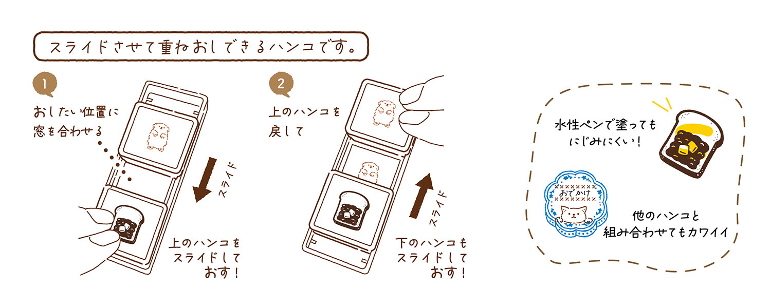 誰でも簡単に紙面をかわいくできるハンコは手帳やギフトカードのデコレーションアイテムとして大人気。手軽さから手持ちのハンコを組み合わせてアレンジをしている人も多いと思います。しかし、2つのハンコを重ねておす時に位置合わせの難しさから微妙にズレてしまい、せっかくのアレンジが台無しと悩む声も。ハンココスライドは、おしたい位置にケースの“窓”を合わせたら、窓に向かってハンコをスライド!すべらせるだけだから位置合わせの必要がなく、ぴったり重ねおしすることができます。上から水性ペンで塗っても滲みにくいから、色を塗ったりモチーフを描き足したりとデコレーションがとてもはかどります。
