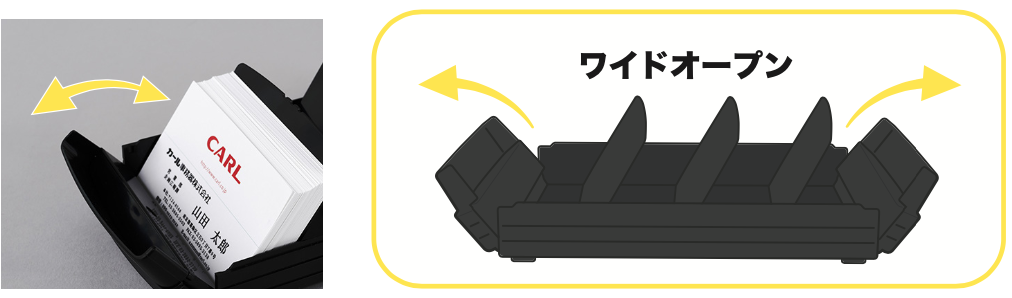 ボックスの両端が外側に開くワイドオープン型仕様なので、名刺が見やすく探しやすい。