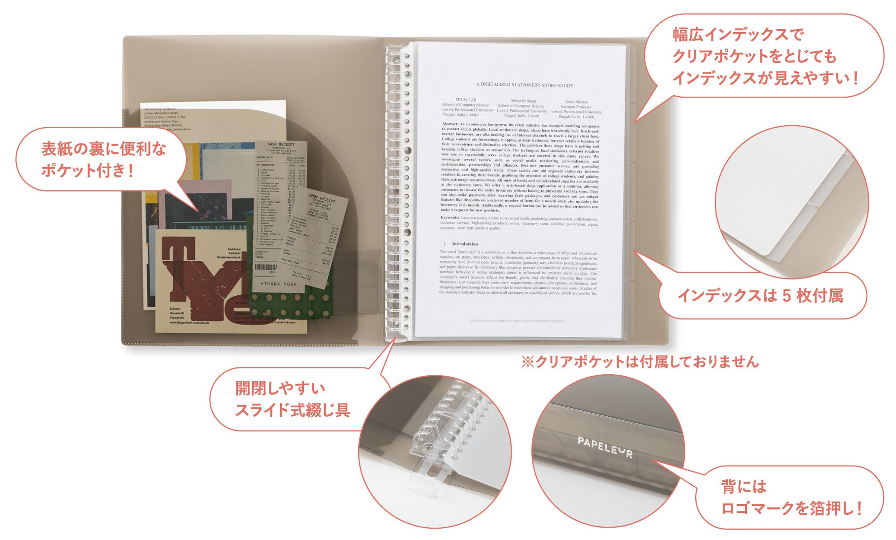 通常のインデックスより横が長い"幅広インデックス"5枚付きで、市販のクリアポケットをとじても見出しが隠れずに見えやすい仕様です。