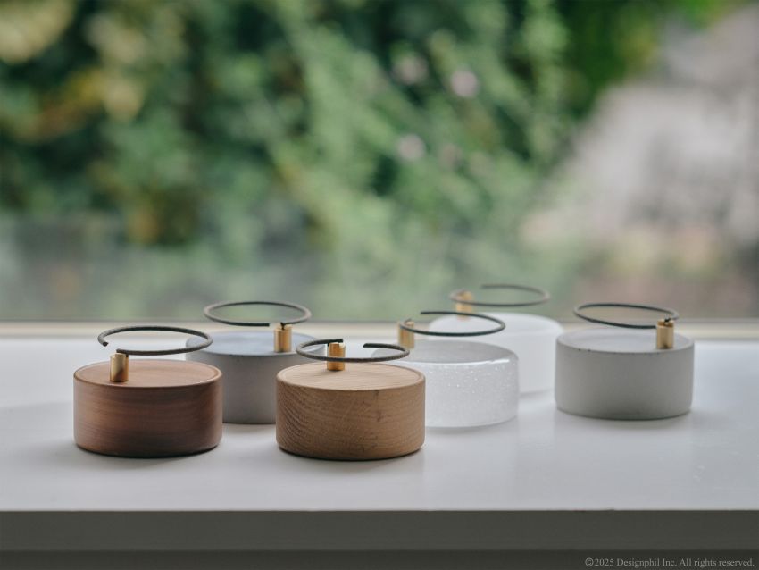 素材の表情を生かしたモルタル、木、ガラスの台座に、経年変化を楽しめる真鍮パーツを組み合わせた香台です。
