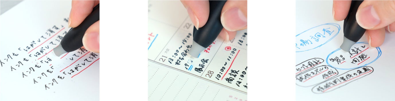 例えば手帳や日記、子どもの連絡帳など、間違えても専用の消し具できちんと消して書き直せるから、書くことがもっと自由に楽しくなる。