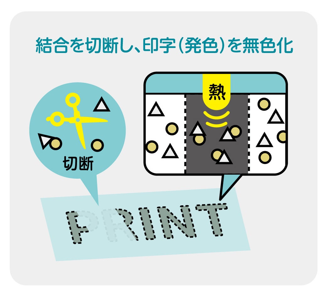 レシートなどに使われている「感熱紙」には、2つの材料が入っています。熱が加わると、この2つが結合し発色します。本商品のインキは、この結合を切断する作用があるため、印字を消すことができます。