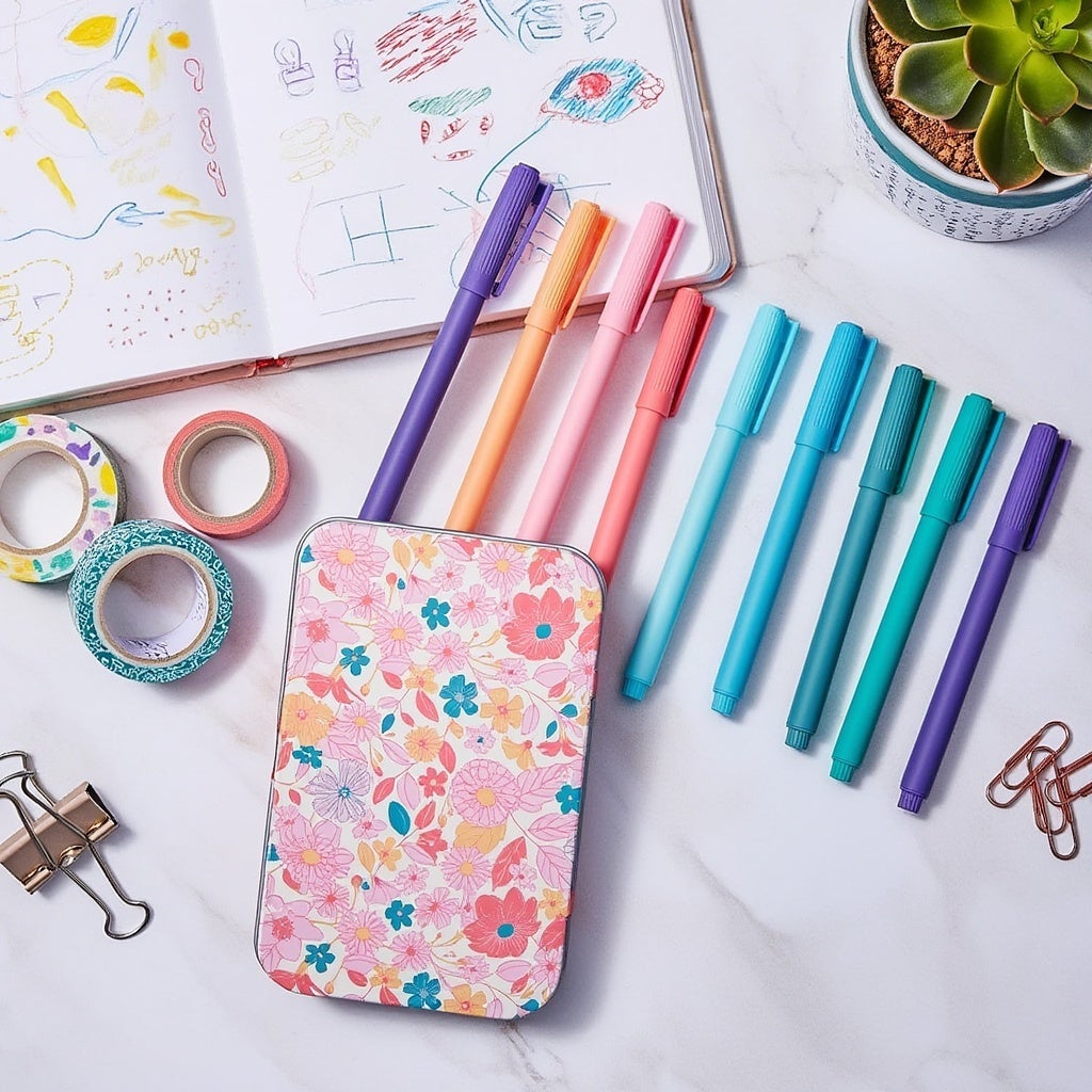 花柄のケースに入ったカラーペンセット。日記や手帳をカラフルに。