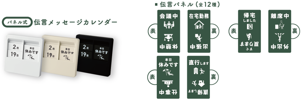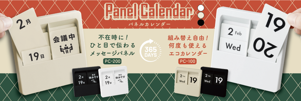 月、日、曜日のパネルを組み替える「日めくり万年カレンダー」(PC-100)と、月、日、メッセージパネルを組み替える「伝言メッセージカレンダー」(PC-200)の2種類をご用意。毎日を共にする卓上アイテムとして、ぜひお手元でその存在感を実感してください。