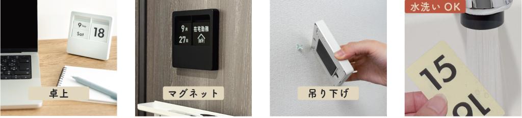 デスク上のほか、パーテーションに吊り下げたり、玄関扉や冷蔵庫に貼り付けたりと、さまざま場所に設置できます。さらに、パネル部分は水洗い可能なため、清潔にお使いいただけます。