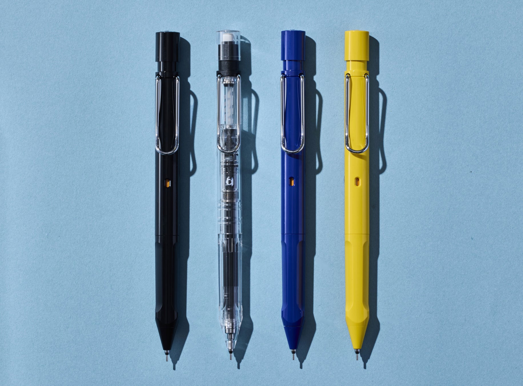 『LAMY safari KURUTOGA inside』 左から: ブラック、ビスタ、ブルー、イエロー