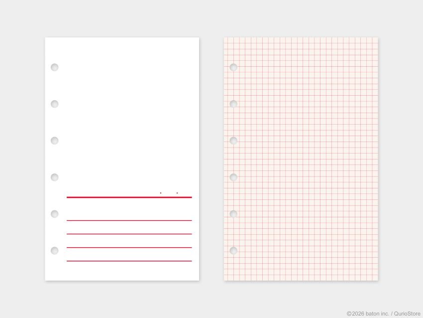 スタンプを押しても裏抜けしにくいスタンプ用リフィル、方眼タイプのメモ、チケットなどを収納できるクリアファイルなど、用途に応じて使い分けができる3タイプのリフィルをセットしています。