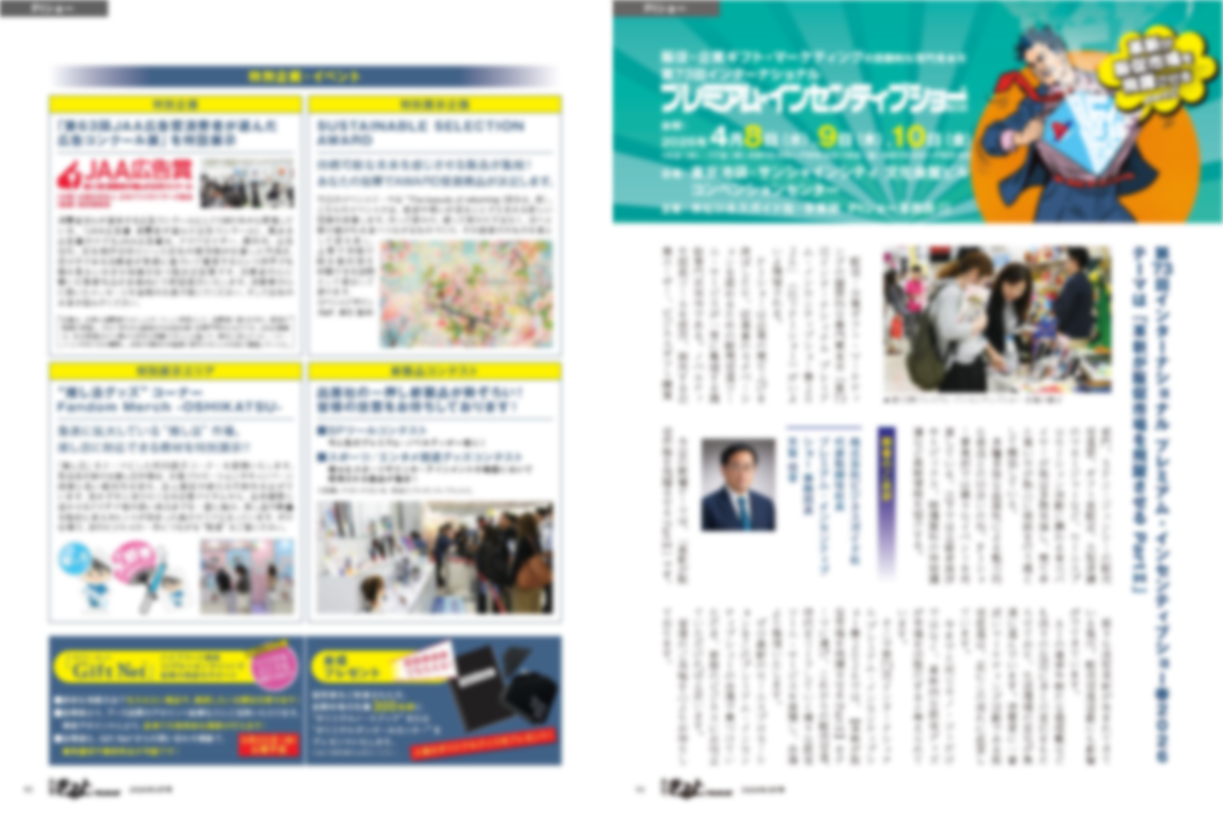 また、4月8~10日にサンシャインシティ文化会館ビルにて開催されるプレミアム・インセンティブショー(PIショー)の合本号として、注目出展社やセミナー、関連特集「販促最前線」も展開。PIショー会場でもご購入いただけます。
