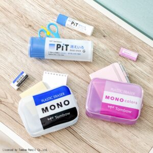 「モノ消しゴム」「消しゴムモノカラーズ ピンク」「消えいろピット」のデザインをあしらいました。文房具や小物の収納にぴったりサイズ。