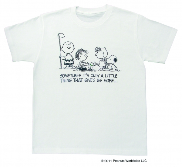 T シャツにはスヌーピー、チャーリー・ブラウンとその仲間たちが、大地に新芽を植え育てている様子を描いたイラストと、「ときにはほんのちょっとしたことが僕らに希望をあたえる・・・」(訳谷川俊太郎)というピーナッツのコミックから引用した原作者チャールズM. シュルツ氏のメッセージがプリントされております。このイラストは、CA が被災地の早期復興を祈念して新たに描き起こしたもの。