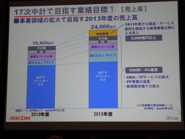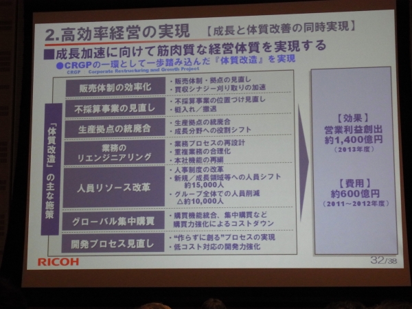 リコーは26日、2013年度売上高24,000億円、営業利益2,100億円を目標とする中期経営戦略を発表。あわせて、高効率経営実現に向け、不採算事業の見直しをするとともに、グループ全体で向け1万人の人員を削減す方針を明らかにした。