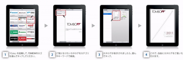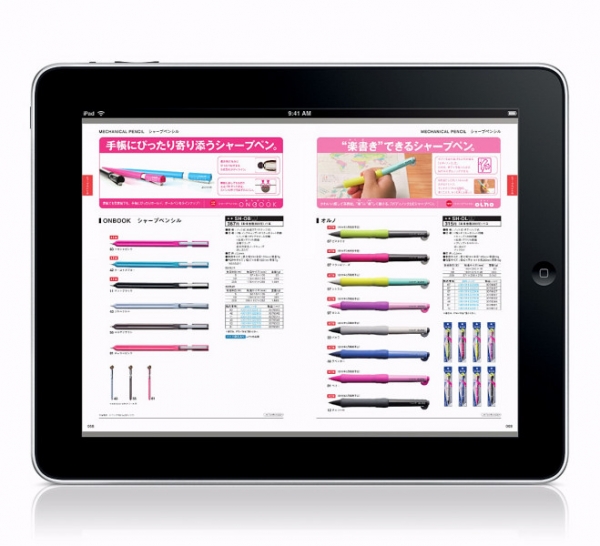 トンボ鉛筆の2011年版「トンボ鉛筆 総合カタログ」などが、5月からアップル社iPad/iPhoneで閲覧できるようになった。凸版印刷が提供するデジタルカタログ閲覧アプリ「iCata」を利用し、お手持ちのiPad/iPhone画面で手軽にどこでもタップ、スワイプ、フリック、ピンチIN/OUTなどして閲覧できる。