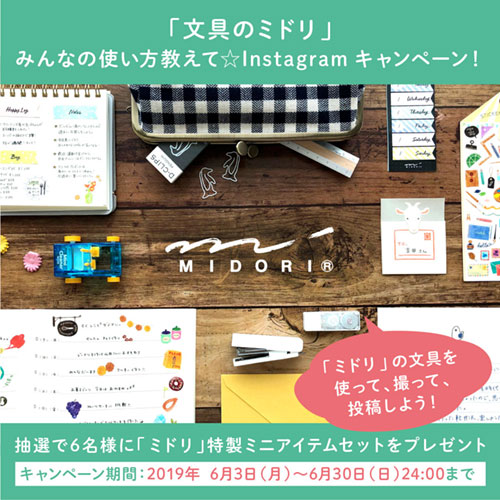 デザインフィルは、プロダクトブランド「ミドリ」の公式 Instagram「文具のミドリ」(@midori_designphil)は、 初めての Instagram キャンペーンとして<「文具のミドリ」みんなの使い方教えて☆Instagram キャンペーン>を6 月 3 日(月)から 6 月 30 日(日)に開催。