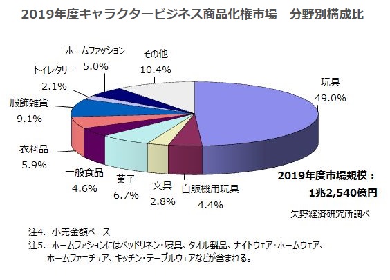 2019年度のキャラクタービジネス市場規模(商品化権、版権)は前年度比101.8%の2兆5,340億円と成長した。令和最初のメガヒット作ともいわれる「鬼滅の刃」を中心に、アニメ化されたキャラクターが好調に推移した。