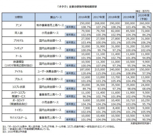 同調査における「オタク」市場は分野により好不調はあるものの、主要分野であるアニメ市場とアイドル市場は2019年度までは堅調に推移した。