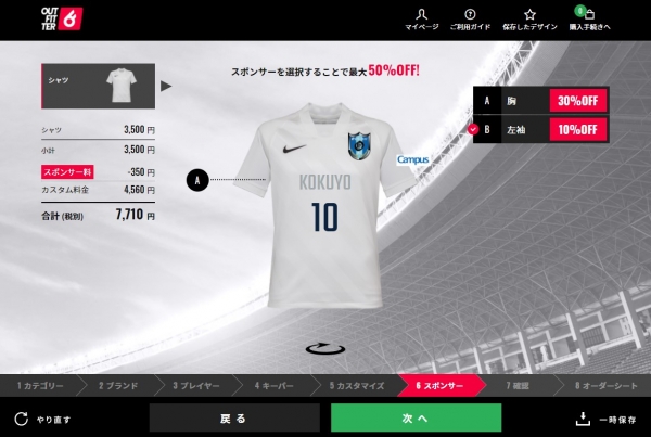 「Outfitter」は、お客様が選んだスポンサー企業のロゴを印字したサッカー/フットサル用のオリジナルユニフォームをオンラインで簡単に作成・購入ができるECサイトです。スポンサー企業のロゴを入れる位置や個数に応じて、ユニフォーム代金の10%~50%の割引が受けられる、国内唯一(※)のサービスです。