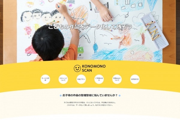 「KONOMONO SCAN」は、子育て中のご家庭に多く存在するお子様の作品を画像データ化するサービスです。