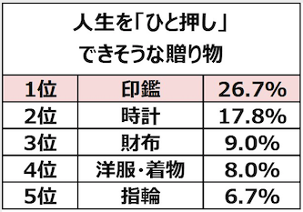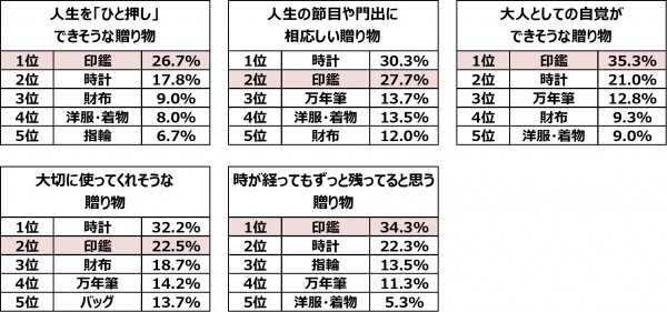 子どもの人生の門出や節目では様々な真心を込めた贈り物をプレゼントしますが、“人生を「ひと押し」できそうな贈り物”、“大切に使ってくれそうな贈り物”など、いろいろなシーンでそれにふさわしい贈り物はそれぞれどうなっているのでしょうか?ランキングのトップ5は以下のように、「印鑑」と「時計」で1位と2位の上位を占める結果となりました。人生や門出を祝うもの、思いや願いを込めたもの、大切に長く使って欲しいものなど、どれも親から子への深い愛情がありますが、特に“親だからこそ贈りたい”ものとして「印鑑」や「時計」は大切に考えられているようです。