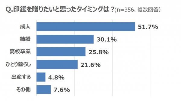人生の節目に大切なものとして感じられている印鑑を、子どもに贈りたいと思った親世代は59.3%にのぼることが調査より明らかに。印鑑を贈りたいと思った経験がある方にそのタイミングを聞いたところ、「成人」が最も多く51.7%の約半数、ついで「結婚」30.1%、高校卒業25.8%、ひとり暮らし21.6%と、我が子の人生の門出や節目に贈り物としての印鑑があることが分かりました。