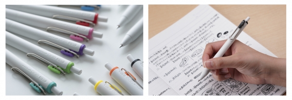 ゲルインクボールペンは豊富な色数が特徴で、学生を中心に広く親しまれています。『uni-ball one (ユニボール ワン)』は、学生が勉強するペンに「濃く書きたい」ことを求めているということに注目し、開発した商品です。一般的なゲルインクと比べ、黒色は一層濃く、カラーはより鮮やかに発色し、後で見返した時にくっきりキマる印象的なノートを作ることができます。