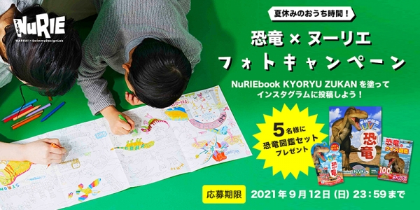 恐竜図鑑のぬりえ「NuRIEbook KYORYU ZUKAN(ヌーリエブック キョウリュウ ズカン)」を塗っている写真や動画をインスタグラムで募集。ご応募いただいた方の中から5名様に、賞品として恐竜図鑑セット(「学研の図鑑LIVE恐竜」1冊、「恐竜のクイズ図鑑」1冊、「恐竜バスボール」1個)をプレゼントします。