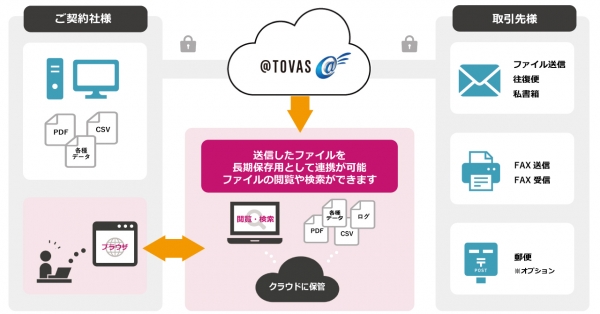 @Tovas(あっととばす)は、請求書や納品書、注文書などの帳票のPDFデータを、アップロードするだけで「WEB」「FAX」「郵送」でお届けする帳票配信クラウドサービスです。