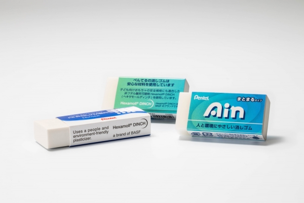文具メーカーぺんてる株式会社(本社:東京都中央区、代表取締役社長:小野裕之、以下「ぺんてる」)と、総合化学会社BASF(本社:ドイツ ルートヴィッヒスハーフェン)の日本法人BASFジャパン株式会社(本社:東京都中央区、代表取締役社長:石田 博基)は、このたび、ぺんてるが製造・販売する「Ain」(アイン)及び「Hi-POLYMER」(ハイポリマー)ブランドの全てのPVC(ポリ塩化ビニル)製消しゴムにおける可塑剤を、BASFの非フタル酸系可塑剤「Hexamoll® DINCH」(ヘキサモールディンチ)へ、完全に切り替えました。