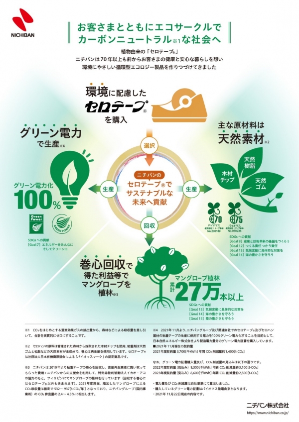 ニチバン株式会社(本社:東京都文京区、代表取締役社長:高津敏明)は、ニチバングループおよび関連会社において、セロテープ®およびセロハン基材の粘着テープの製造に使用する全電力量と、本社、全国7つの営業オフィスにて使用する全電力量に相当するグリーン電力証書の購入に関する契約を日本自然エネルギー株式会社(本社:東京都品川区、代表取締役社長:加藤圭輝)と締結しましたのでお知らせいたします。