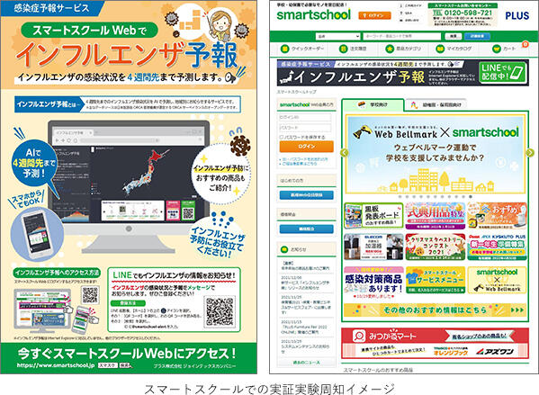 そこで、プラスと日立社会情報サービスは、感染症は流行予測をもとに予防していくもの、という新しいライフスタイルの提案に向け、学校・保育現場に広く浸透している「スマートスクール」と、4週間後までのインフルエンザの流行予測を提供する「感染症予報サービス」を組み合わせることで、より多くの教育・保育従事者へ自律的な判断に役立つ情報を届け、適切な予防や行動の変化を促し、インフルエンザ罹患リスクの軽減をめざします。