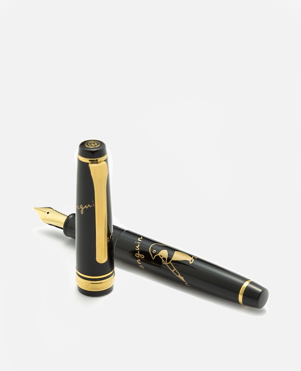 ペンギンのカラーのブラックに見立てたボディには、今回のために特別に描きおろした、万年筆を持ったペンギンのイラストと、"penguin"の文字が散りばめられています。14金のペン先に施された、可愛らしいペンギンの刻印も特徴です。モデルは、ユニセックス且つ世代を超えて大人気の名作「プロフェッショナル・ギア・スリム」を採用しています。