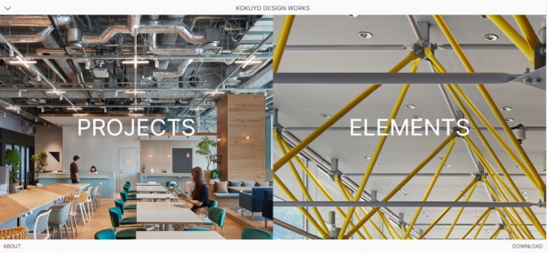 「KOKUYO DESIGN WORKS」は、過去10年で当社が手がけた10,000件以上の空間デザインのなかから、厳選した100件の事例を掲載したWebサイトです。コンテンツは大きく「PROJECTS」と「ELEMENTS」の2つに分かれています。