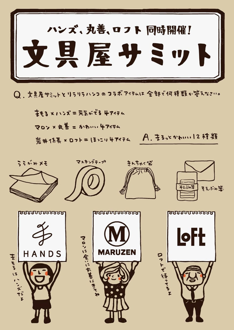 サミット3社のバイヤーと「RiraRiraはんこ」さんの愛用文具を紹介。また、サミット3社それぞれでRiraRiraはんこの先行新商品特別販売を致します。そえぶみ箋、メモ、マスキングテープ、巾着4種類の新デザインが登場します。