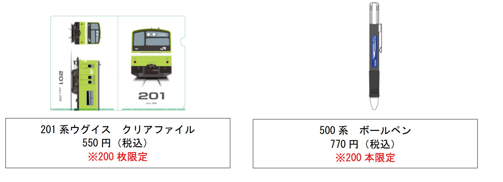 通勤車両で人気の201系と新幹線で人気の500系をデザインした、クリアファイル、ボールペン等の