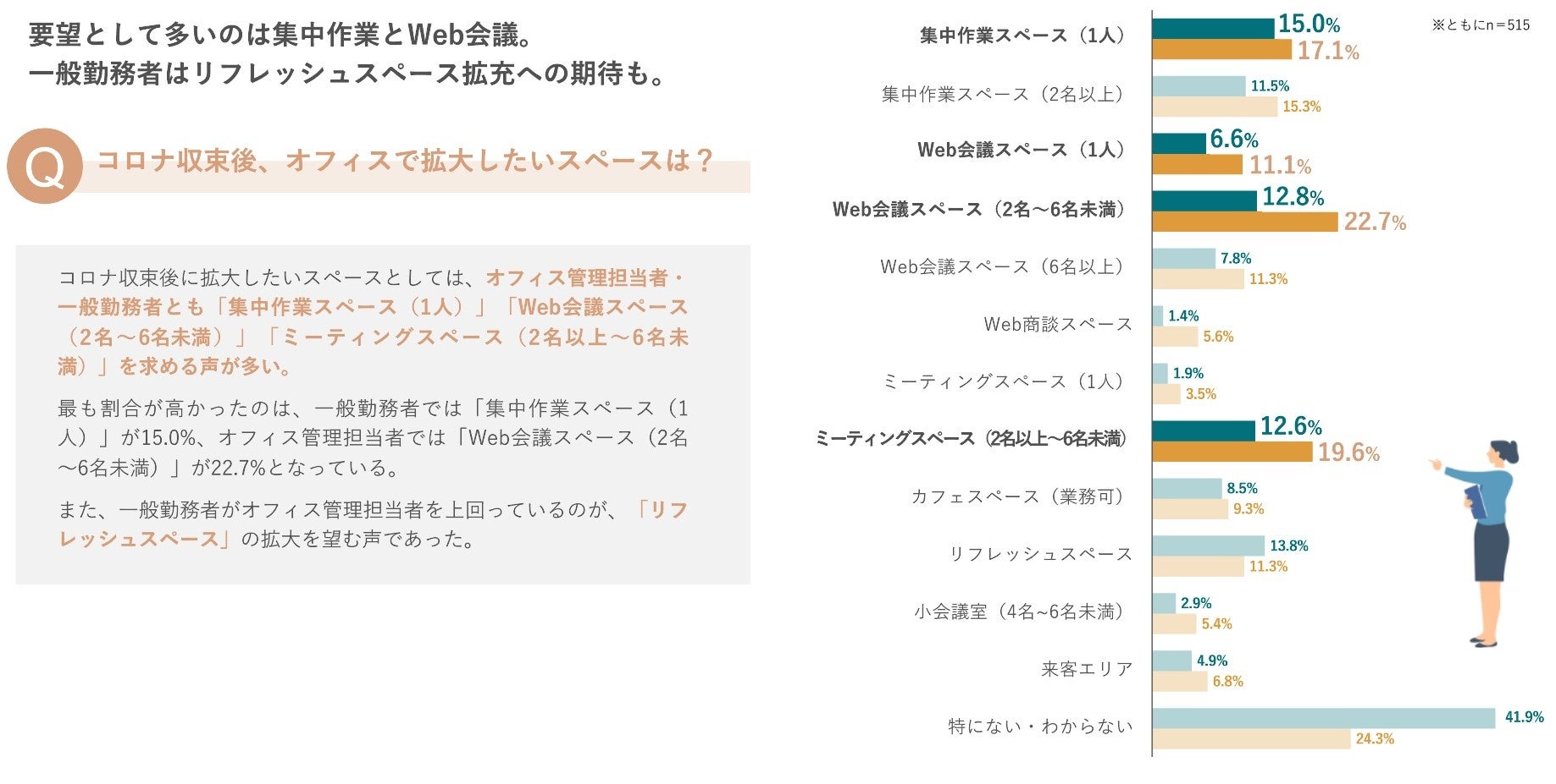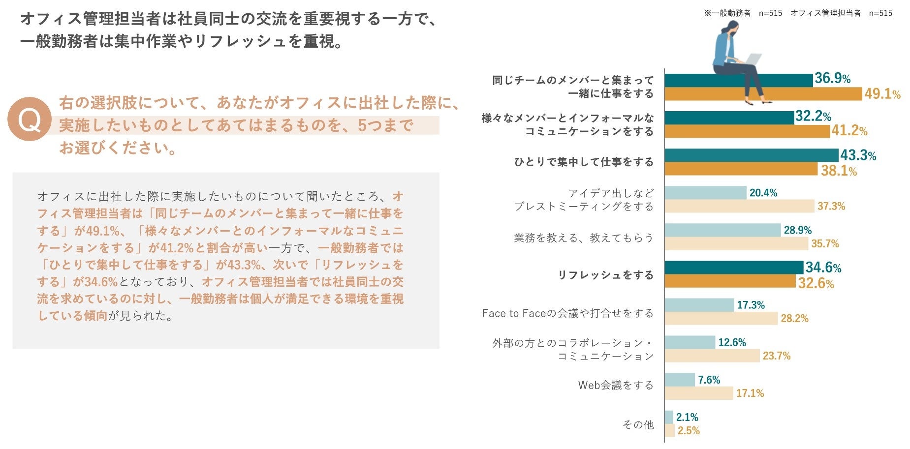 この意識のギャップはオフィスに出社した際に実施したいことに関する調査結果でも明らかになっており、「ひとりで集中して仕事をする」、「リフレッシュをする」の回答は、オフィス管理担当者より一般勤務者の方が高い結果となっています。