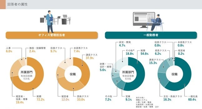 「オフィス環境調査データ2023」の調査対象は全国の企業における総務部門を中心とした「オフィス管理担当者」、各所属部門における「一般勤務者」からそれぞれ選定しています。業種はさまざまで、従業員規模も小規模から大規模まで幅広く集計しています。オフィス環境の提供者側と利用者側双方における就労の実態と要望を捉えることが可能です。