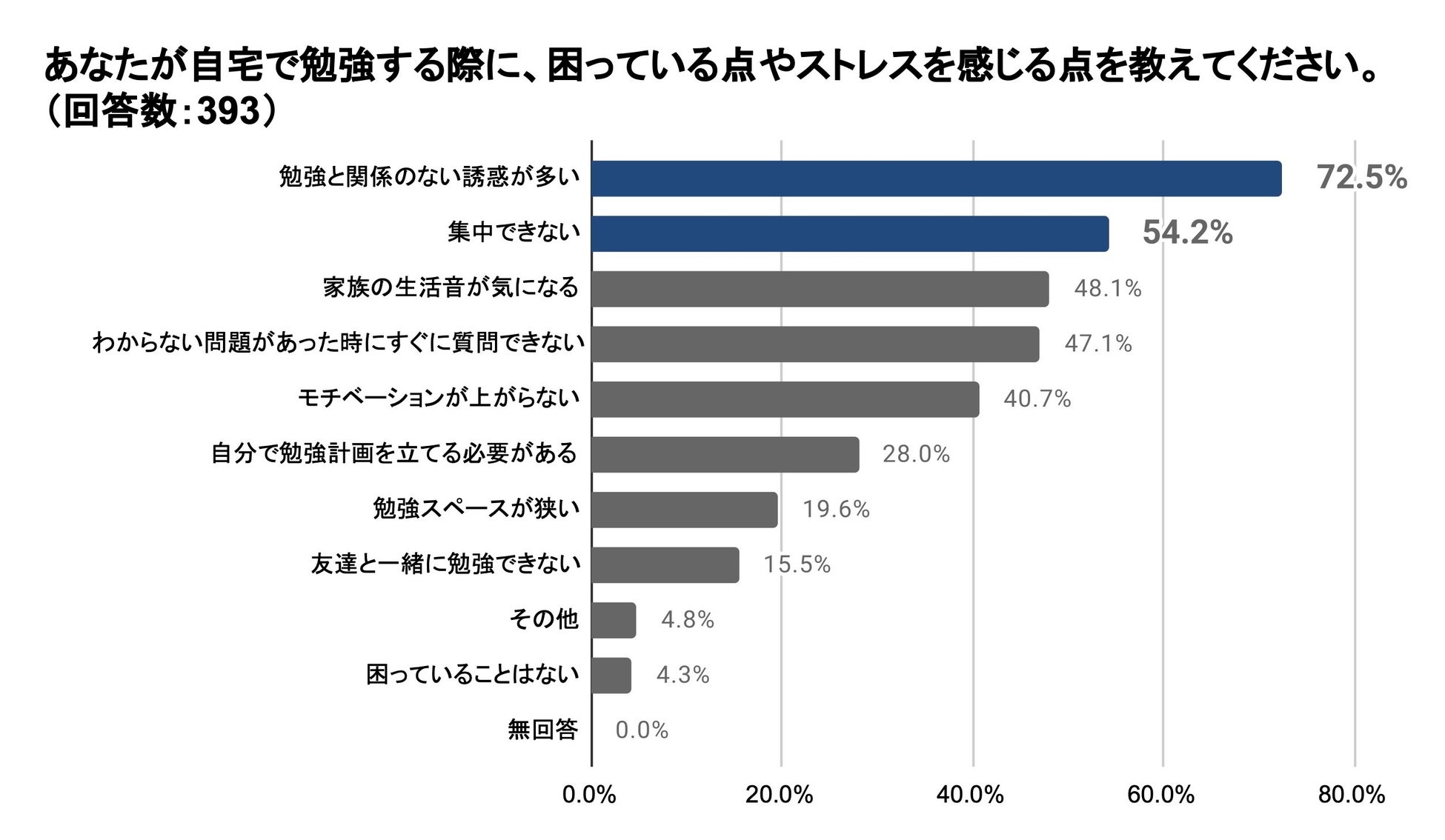 一方、中高生を対象にしたアンケート(※)によると、勉強を行う場所として最も多い自宅での学習においては「勉強と関係ない誘惑が多い(73%)」や「集中できない(54%)」など、学習環境に課題があることが分かりました。