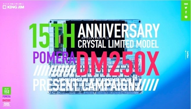 今回のキャンペーンでは、期間中に応募フォーム内にて「ポメラ」への想いを綴っていただいた“熱い「ポメラ」ファン”の皆さまの中から抽選で15名様に「DM250X Crystal」をプレゼントします。また、副賞として限定「ポメラ」イラストシールを100名様にプレゼントします。