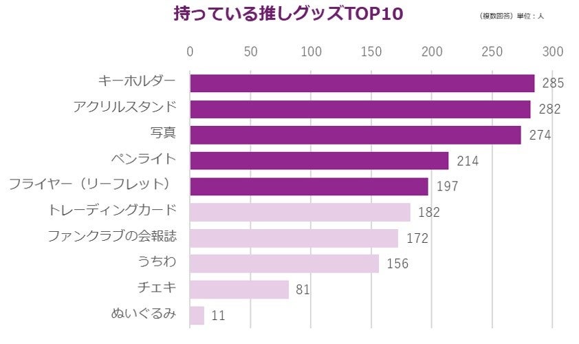 推し活を楽しむアイテムとして欠かせないのが、推しグッズです。推しグッズを持っていると回答した人は96.1%。持っている推しグッズの内訳は下図の通りです。